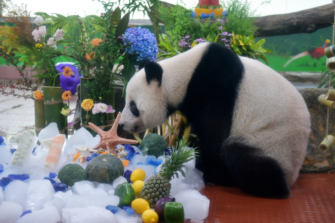 今天一大早,大熊猫馆里就响起“祝你生日快乐”的欢快歌声。等待两位“寿星主人公”的,除了竹子、水果冰搭成的美味生日蛋糕,还有不同风格的生日丰容。“星一”的生日布置主打“热带风情”,保育员以冬瓜为主体,巧手雕刻了一艘“生日游轮”,上面放满各式水果,“游轮”下方铺着蓝色的冰块,让今天的“星一”不仅成了动物园里“最靓的仔”,也成了“乘风破浪”的哥哥。“游轮”旁是由竹子、树叶组成的“椰子树”和竹子风铃,地面铺有碎冰、海星、海螺,仿佛夏日海边。