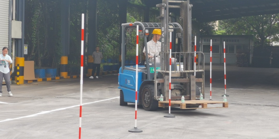赛场上,“绕杆运货”环节。选手们需驾驶叉车沿着曲线前行绕杆,6 次前进,6 次后退,直到倒退到原始位置,考验叉车工对叉车行驶的掌控性。只见梅州公司选手钟荣辉,以其稳健的驾驶技术和惊人的速度,穿梭于障碍之间,每一次操作都恰到好处,引得现场观众阵阵喝彩。而东莞公司的王川川,则以其独特的策略和稳定的发挥紧随其后,两人的较量一度进入白热化阶段。