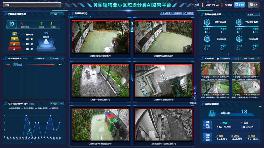 对此,黄阁镇垃圾分类负责人张善强主任表示,要进一步提升垃圾分类工作,不能单一地依靠监督人员上岗巡查的方式。应充分利用信息采集和视频监控设备,结合AI智能远程监管技术,实现主动快速发现问题并及时处置。他进一步介绍,一旦问题在半小时内未得到处置,系统将自动将其提升为高一级别的告警信息。同时,所有的告警信息都会生成一对一的任务,环卫工作人员处理完现场垃圾后,AI监控也会自动识别并闭环掉工作流,无需人工反馈,大大节省了时间和精力。