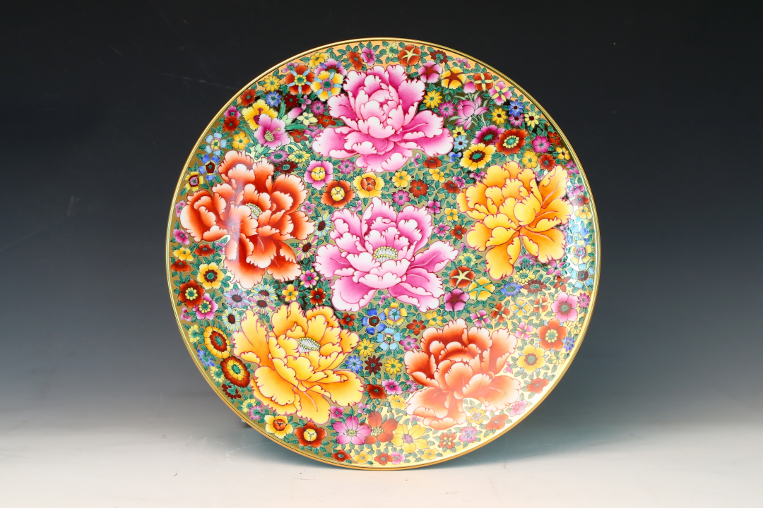 广彩盘《金地牡丹》,采用广彩传统技法和传统题材,突出表现广彩“金碧辉煌、多彩绚丽”的艺术风格。