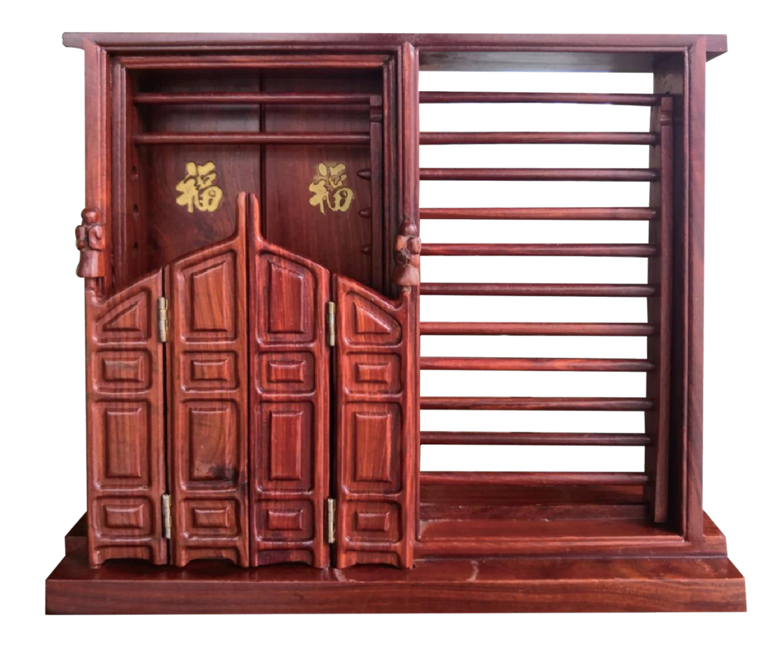 《西关趟栊门》利用木雕精湛的榫卯结构技艺,高度还原西关趟栊门,形象逼真,代表广府传统文化。