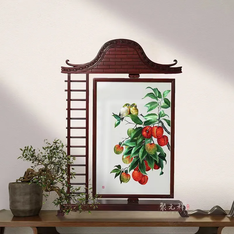 广绣《喜上枝头》趟栊门摆件,设计理念源于岭南建筑耳房与趟栊门,荔枝如宝石般晶莹,鸟儿似精灵般灵动,勾勒出自然的神韵与生命的活力。