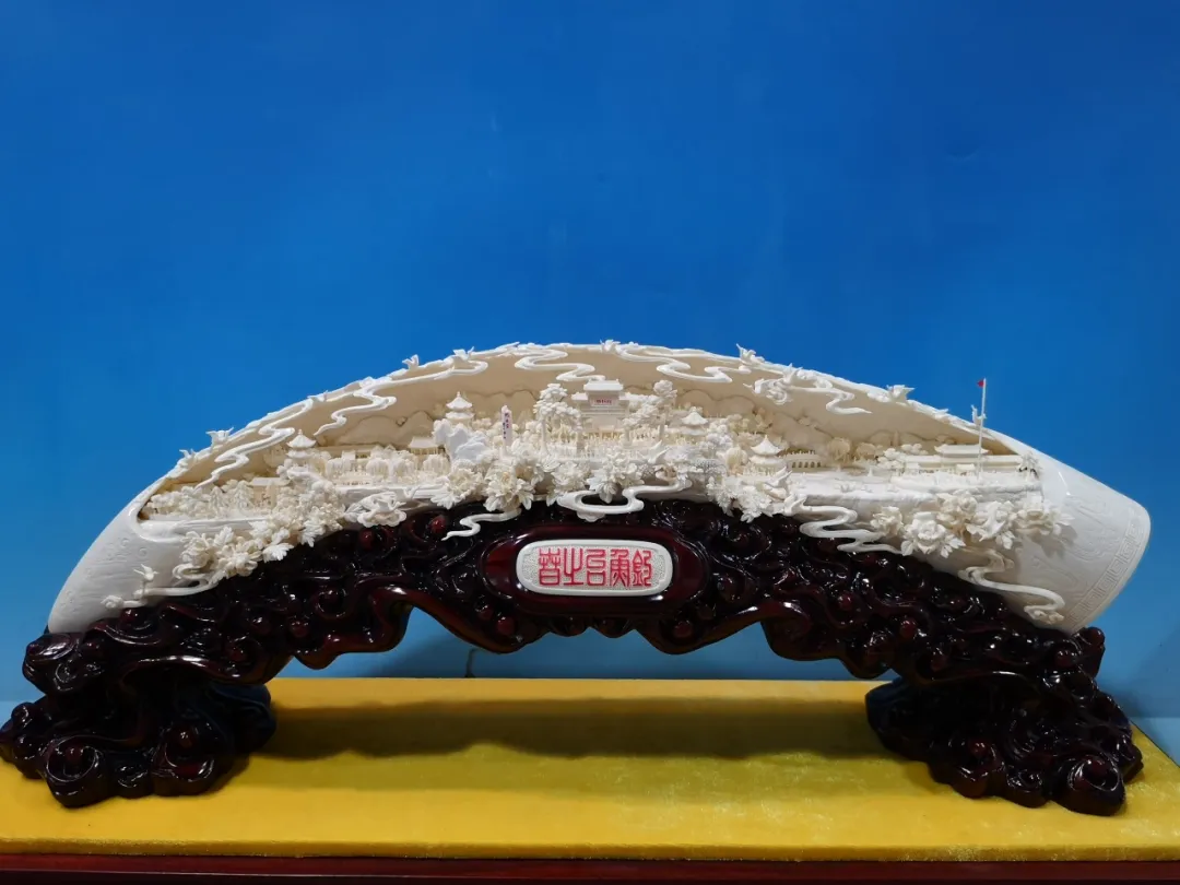 其中,《钓鱼台之春》作品以牛骨为材料,运用精湛的象牙雕刻技艺,以原支象牙石山桥的表现形式,巧夺天工地塑造了北京钓鱼台国宾馆那美丽恢宏、令人神往的优美景象。