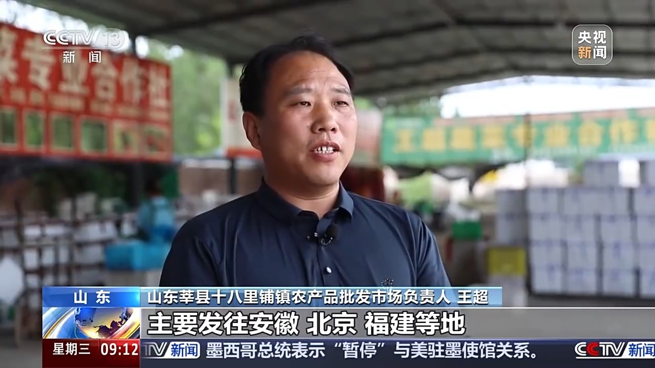 山东莘县十八里铺镇农产品批发市场负责人 王超:每天上市量有十几万斤,主要发往安徽、北京、福建等地,周边的品种逐渐成熟,上市量一天比一天大,呈上升趋势。