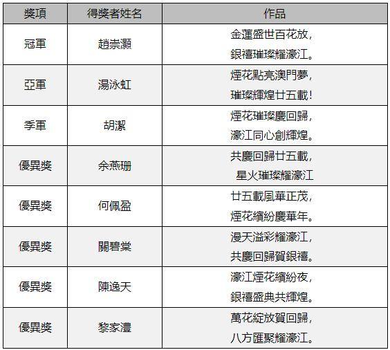 旅遊局代表及專業人士組成的評審團按照比賽主題和評審標準,評選出冠軍、亞軍、季軍和5名優異獎,依次可獲奬金10,000、6,000、3,000和500澳門元獎金及獎狀。得獎名單及作品如下: