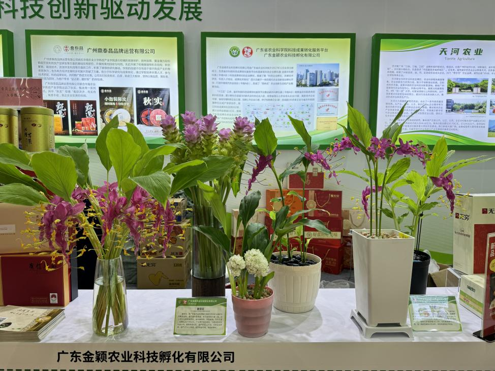 金颖农科孵化器(华南A谷)作为广东省农业科学院科技成果转化暨企业孵化平台,共展出了省农科院水稻、玉米、马铃薯、花生等28个具有自主知识产权的农作物优良新品种和特色果树、花卉,并携部分入驻企业新产品进行现场推介。其中,省农科院环艺所自主选育的花卉新优品种——“红蔓”舞花姜(Globba “Hongman”)是国内首个认定的舞花姜新品种,首次公开展示便受到各方关注和喜爱。
