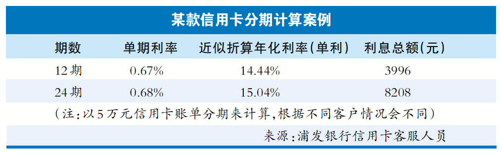 “用了信用卡分期,将4800元分3期还款,每期分期利息约86.4元,算了之后才发现分期近似折算年化利率竟然有10.77%。”使用某国有大行信用卡的林女士说。记者调查发现,目前多家银行信用卡推出分期相关优惠活动。如民生银行官方显示,6月20日至12月25日,办理12期及以上账单分期、现金分期等分期业务,达标到一定金额即可兑换消费金或5折分期红包;华夏银行官方显示,近期正在向受邀客户派发666元和1618元分期抵扣券,在办理账单分期或灵活分期时可使用。