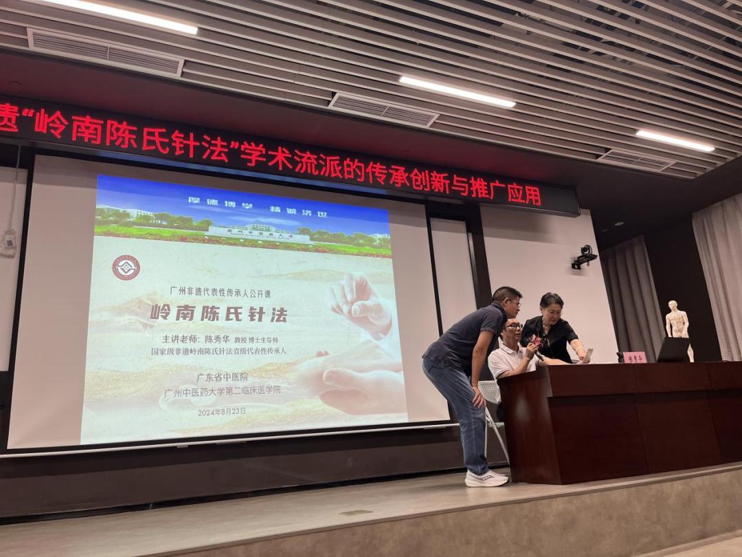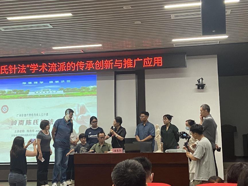 中医针灸于2010年入选联合国教科文组织非物质文化遗产名录,针灸是当今全球应用最广泛、接受程度最高的中国传统医学。“岭南陈氏针法”历经陈宝珊、陈锦昌、陈全新、陈秀华等六代人129年的发展、传承与创新,是岭南中医针灸最具代表性的学术流派之一,其学术体系包含飞针法、分级补泻法和导气法。以“无痛、无菌、快速旋转”为特点的快速旋转进针,能达到无痛、微痛的效果,让针灸更容易被公众所接受。“岭南陈氏针法”先后入选广东省第六批省级、第五批国家级、广州市第七批市级非遗项目,陈秀华在非遗课上分享了学术流派名医略传、传承创新、成果产出及推广应用等内容,展示了该项目在传统医学领域的传承发展和影响力。