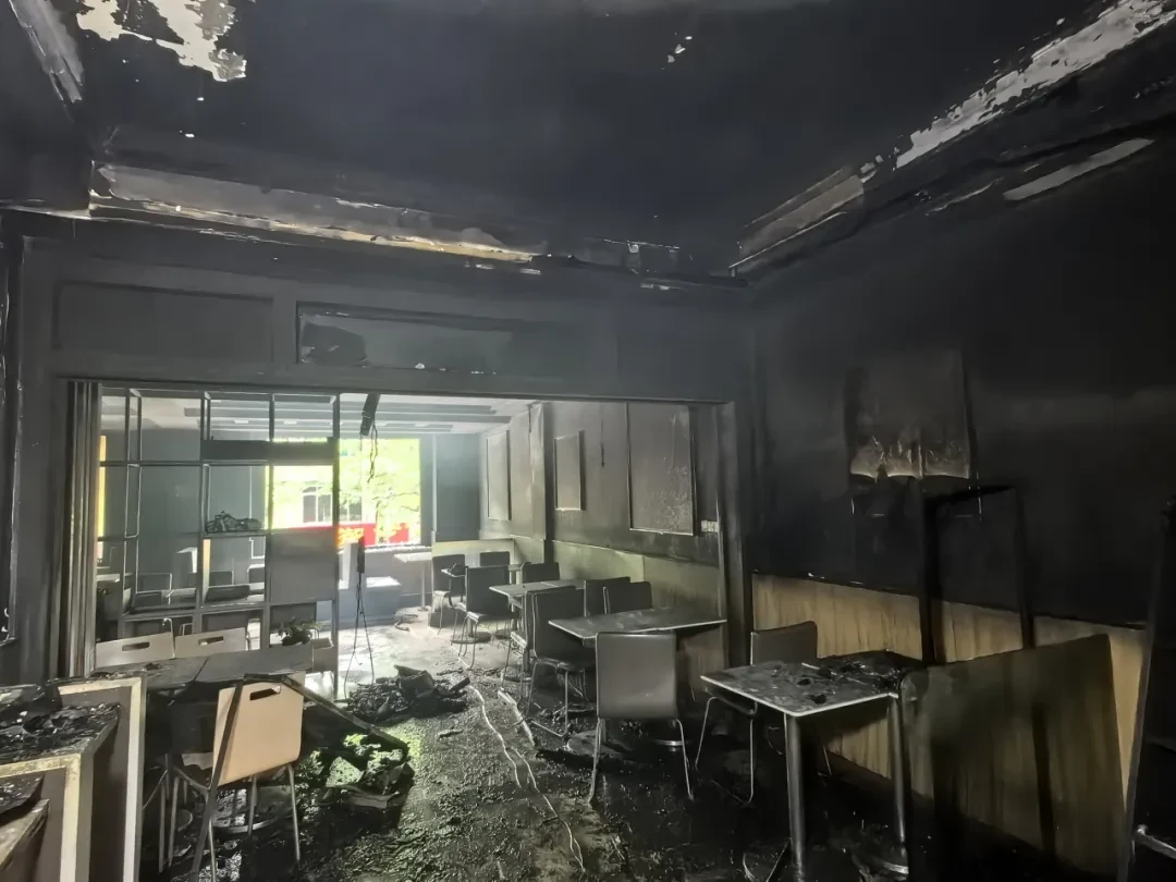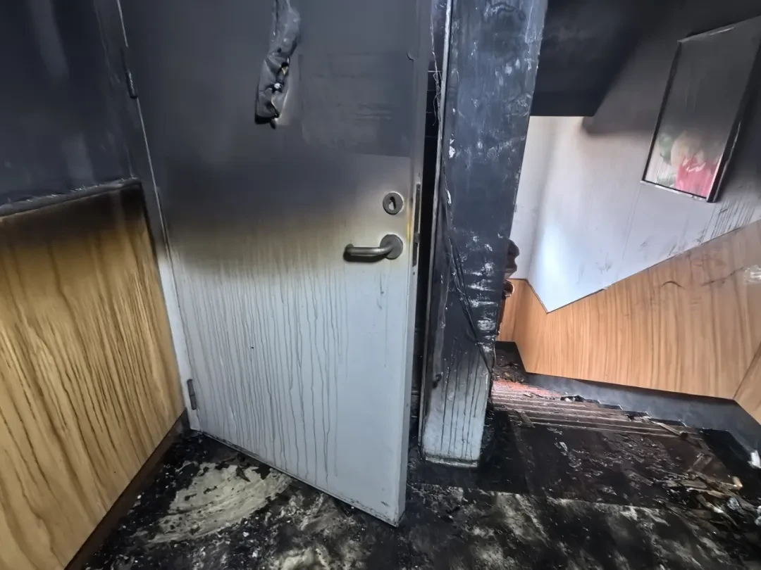 现场图片显示,楼梯间的防火门有明显过火痕迹,但在半个多小时的大火中未变形损毁,并有效隔绝了火势与烟气蔓延,为楼上居民争取到了宝贵的逃生时间与安全空间。