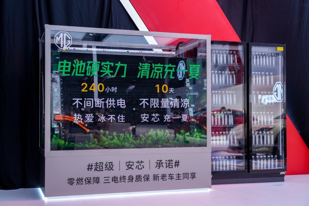 值得一提的是,为了呈现其“硬核实力”,此次车展上汽MG名爵展台还将一块“零燃电池”浸泡在水中作为饮料柜的“能量之源”,为观众提供清凉的饮料解暑。据悉,“零燃电池”即便被水浸泡也依然能够稳定为饮料柜提供源源不断的电力,展现出上汽MG名爵“零燃电池”的黑科技以及“超级安芯承诺”的底气。