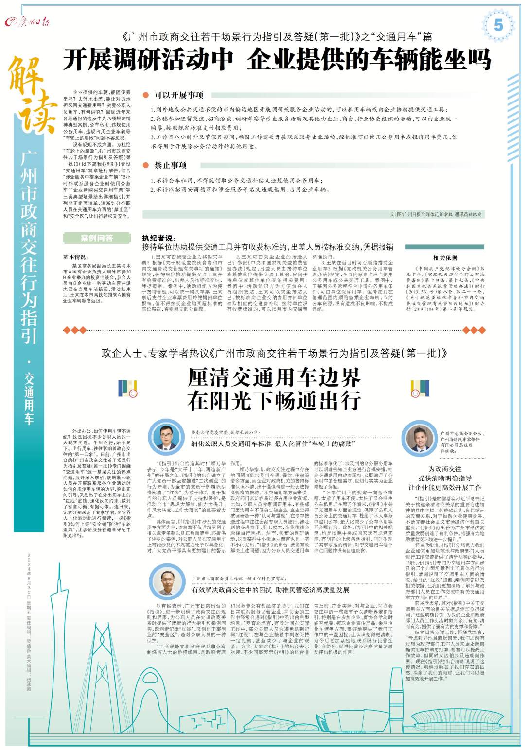 没有规矩不成方圆。为杜绝“车轮上的腐败”,《广州市政商交往若干场景行为指引及答疑(第一批)》(以下简称《指引》)专设“交通用车”篇章进行解答,结合“涉企服务中搭乘企业车辆”“8小时外联系服务企业时使用公务车”“企业帮购买交通用车票”等三类典型场景给出详细指引,并列出正负面清单,清晰划分公职人员在交通用车方面的“禁止区”和“安全区”,让出行轻松又安全。