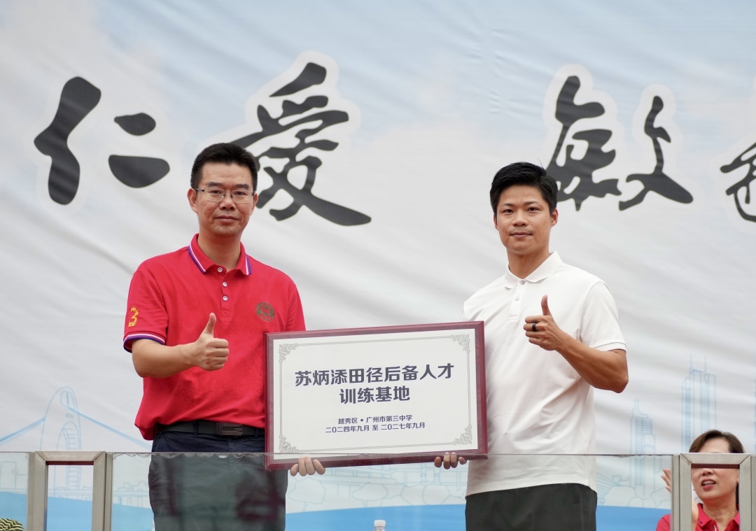 广州市第三中学教育集团理事长、广州市第三中学党委书记陈汉碧与苏炳添共同完成了“苏炳添田径后备人才训练基地”牌匾的揭幕。
