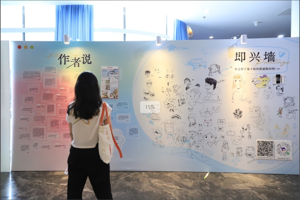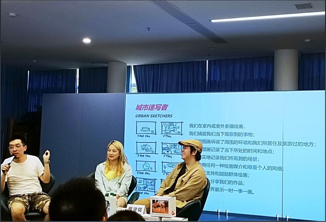 在分享现场,几位分享者的话音未落,旁边已有速写爱好者把他们这一时刻的画面画在了涂鸦板上,圆桌、笑脸、夏日阳光,这些特别的元素都在画面中呈现出来。“人在画外,人也在画中”。