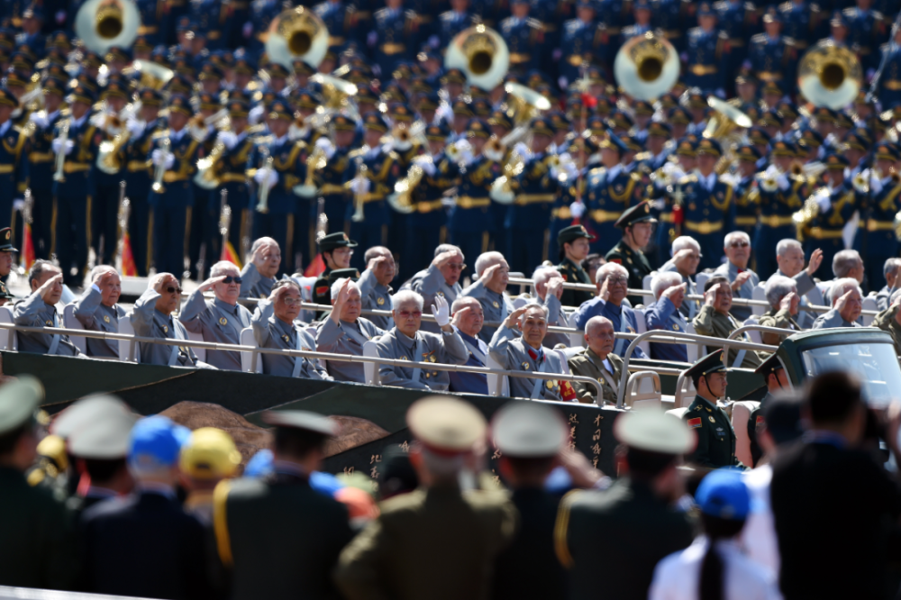2015年9月3日,中国人民抗日战争暨世界反法西斯战争胜利70周年纪念大会在北京隆重举行。这是抗战老兵乘车方队通过天安门广场。