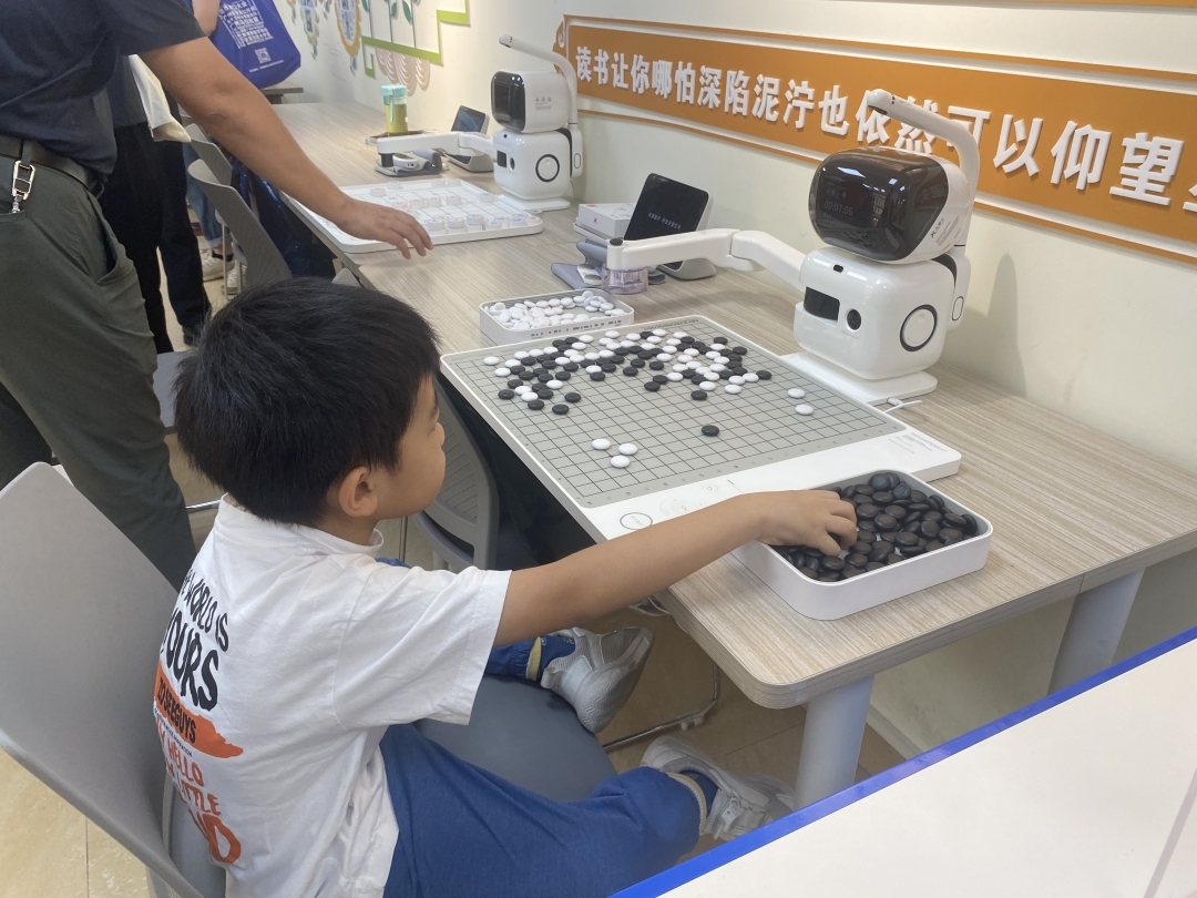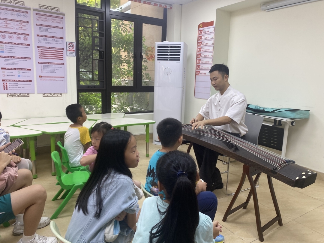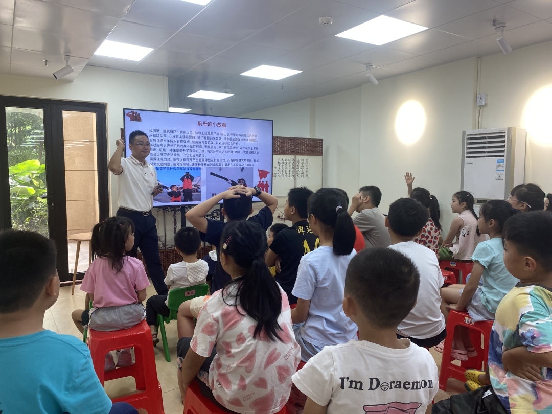 华尚社区居委会位于居民楼下,隔壁就是省实荔湾一小,这里既是居委会办公地,也是社区长者饭堂配餐点、儿童活动阵地。开学在即,记者探访了社区托管夏令营。上午10时左右,这边,白鹤洞街道红棉老兵志愿队志愿者正在为20多位小朋友儿童上国防教育课,课堂上你问我答、气氛热烈;那边,几位小朋友端坐着,饶有兴致地听老师演奏古筝,隔壁的社区科普馆里,一个小朋友正在棋盘前与AI斗智斗勇。国防教育课结束后,小朋友们纷纷来到科普馆,在喜欢的科普互动项目旁排起了队……
