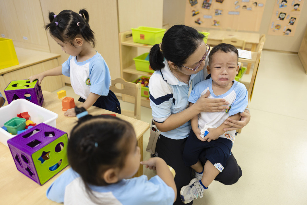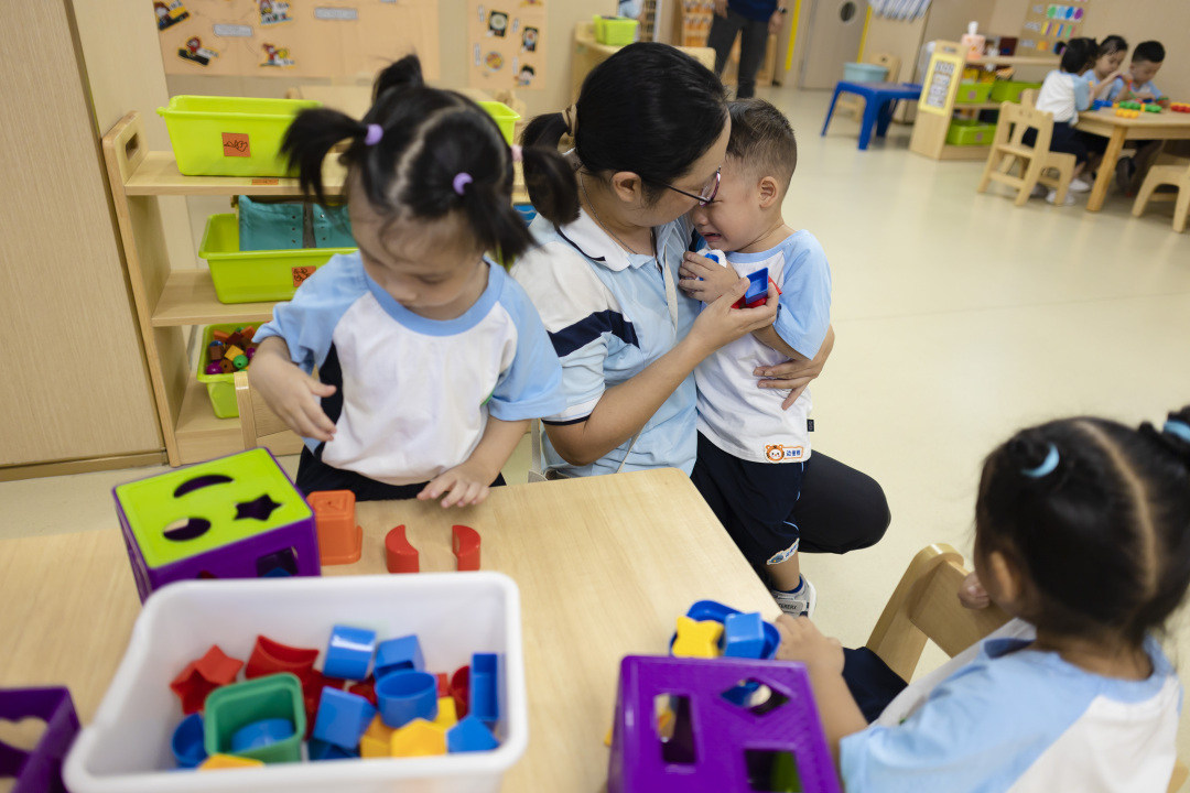 老师安慰因分离焦虑而哭泣的幼儿