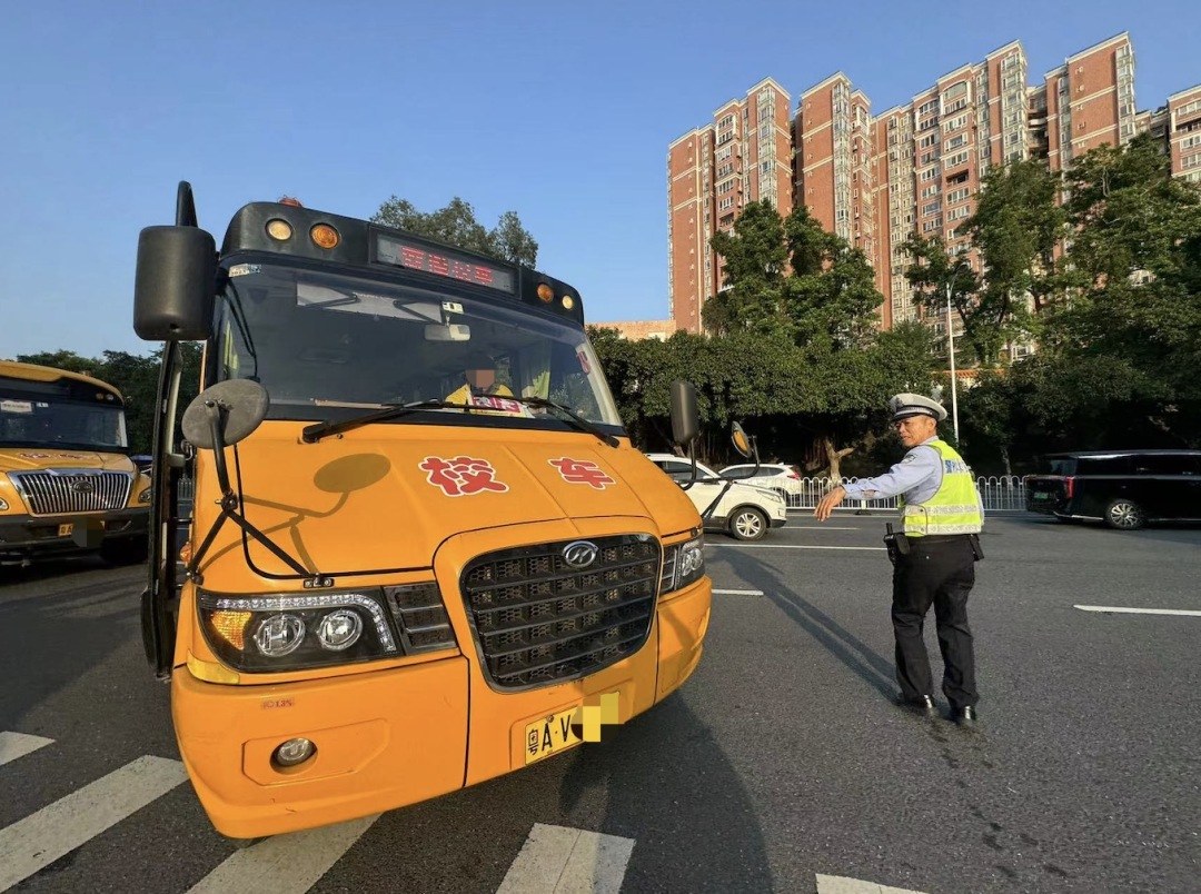 当天,为保障开学日全市交通秩序,广州交警最大限度将警力投放到路面,通过在学校周边路段设置“护学岗”,出动“羊城铁骑”加强各大主干道巡逻管控,全市范围内严查校车交通违法行为,为返校师生提供一个安全、有序的交通出行环境。
