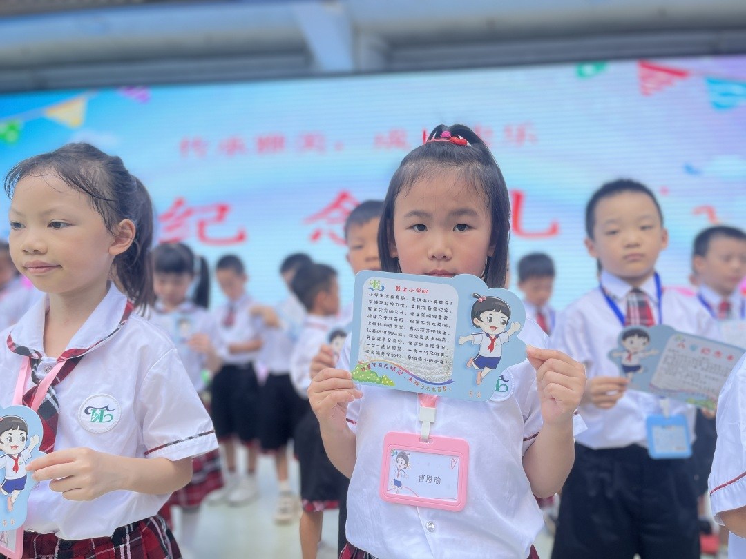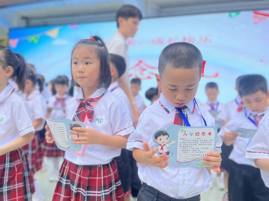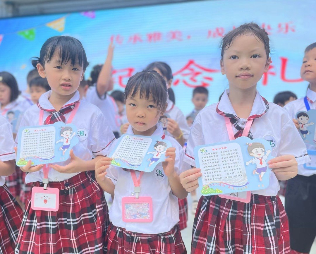 在“传承礼”环节,二至六年级的哥哥姐姐将对应的“雅美”班牌,递给低一个年级的弟弟妹妹,作为一种“传承”,并鼓励学弟学妹“快乐学习”。一年级的新生们收获了学校颁发的个性化入学纪念卡,纪念卡上写有成长寄语和“雅美常规”。据介绍,学校以“雅美教育”为办学特色,致力于培养“雅言美行、雅量美德、健康快乐”的雅美学子。