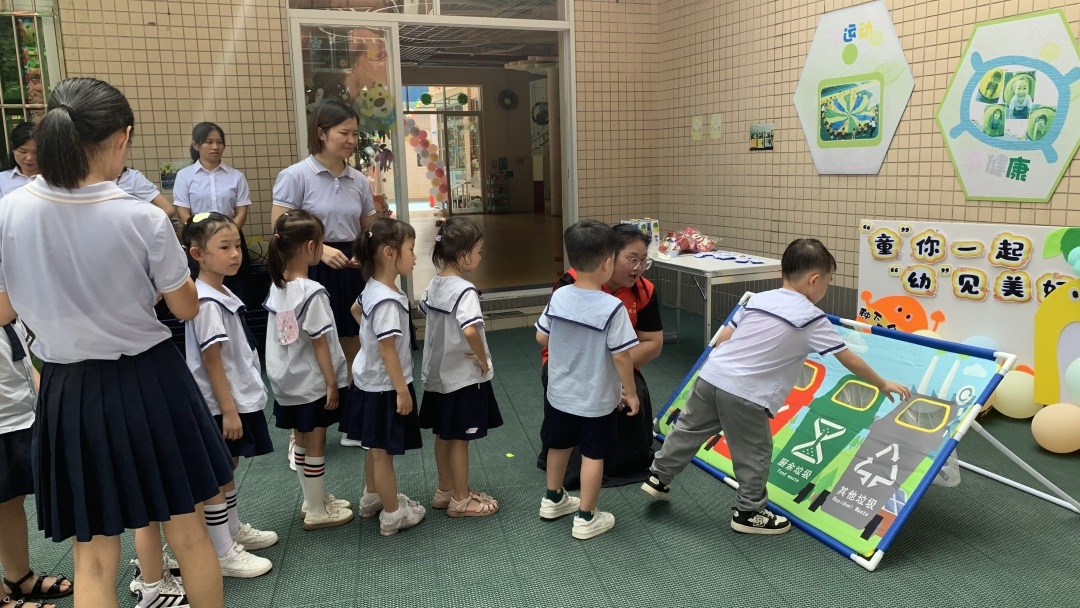 晓强一边玩游戏,一边大声说:“回到家,我也要监督爸爸妈妈、爷爷奶奶,将家中垃圾分类放好,我还要好好吃饭,不剩饭剩菜。”孩子们的认真模样引来了老师们的阵阵掌声和鼓励。