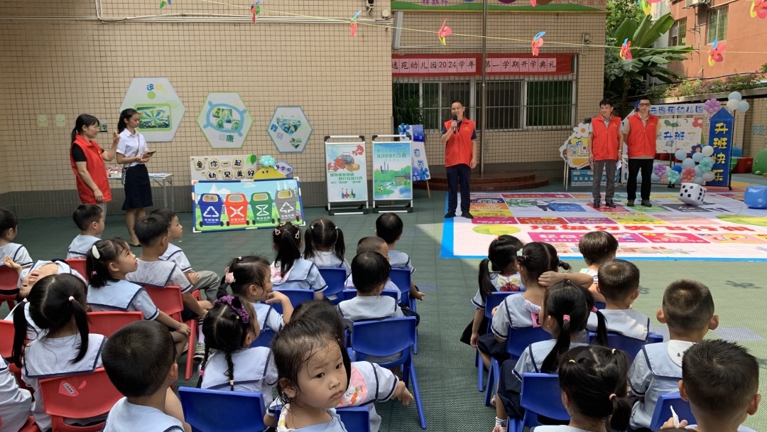 9月2日,开学第一天,广州市白云区云城街市政所联合萧岗北社区党支部,在云逸苑幼儿园开展“开学第一课,垃圾分类宣传”活动,以传承广府粤语文化的新颖方式,向师生传递生态环保理念,倡导大家从小事做起,践行绿色低碳生活方式,共同建设美好家园。