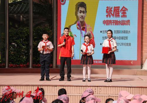 一年级的新生们在学校行政和老师的陪伴下,踏着红地毯进入会场。高年级的哥哥姐姐们以热烈的掌声欢迎他们。随后,五星红旗在雄壮的国歌声中冉冉升起,庄严的升旗仪式标志着文德路小学新学期的正式启航。 伦敦奥运会男子双十米跳台冠军张雁全的现身,更是将现场气氛推向了高潮。
