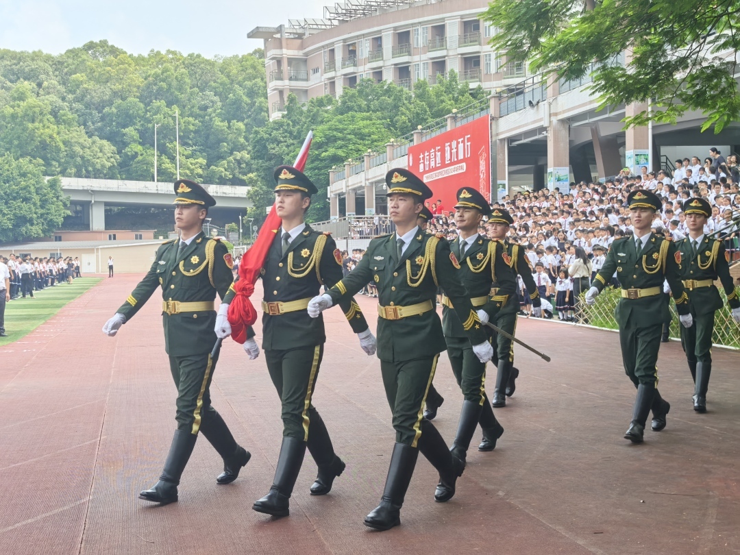 广州市天河区汇景实验学校开学盛典举行。特色活动“赤心国旗护卫队入校开展开学第一课”成为典礼的亮点,赤心国旗护卫队秉承着“护我国旗、壮我国威”的使命,队员都曾服役于中国人民解放军仪仗司礼大队。