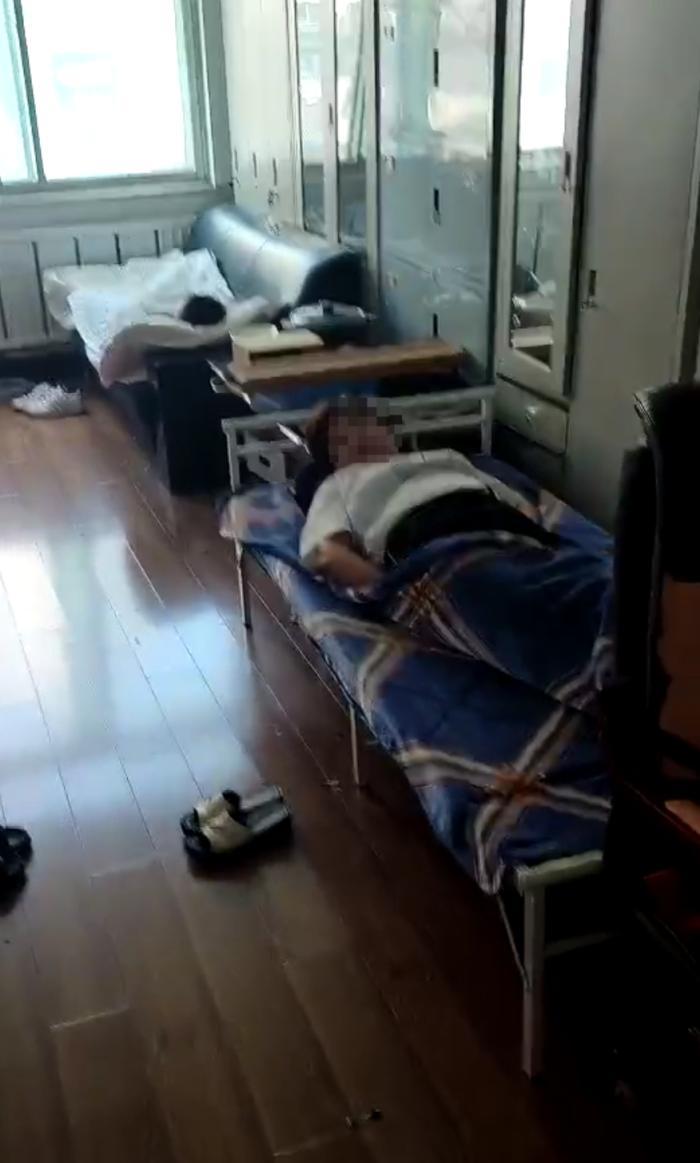 在吴先生提供的几段视频中,记者看到,在一个放有多张沙发和床的屋内,有多人盖着被子躺在沙发或者简易床上睡觉。吴先生表示,当时已经是下午一点十几分钟,是工作时间。