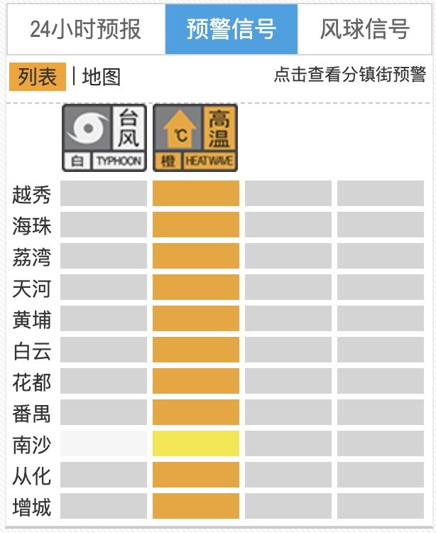另据@广州天气消息,预计未来两天广州市越秀区、天河区最高气温将接近37℃,目前,越秀、天河、海珠、荔湾、黄埔等多区高温橙色预警信号生效,户外活动请注意防暑降温、及时补水,并注意用火用电安全。