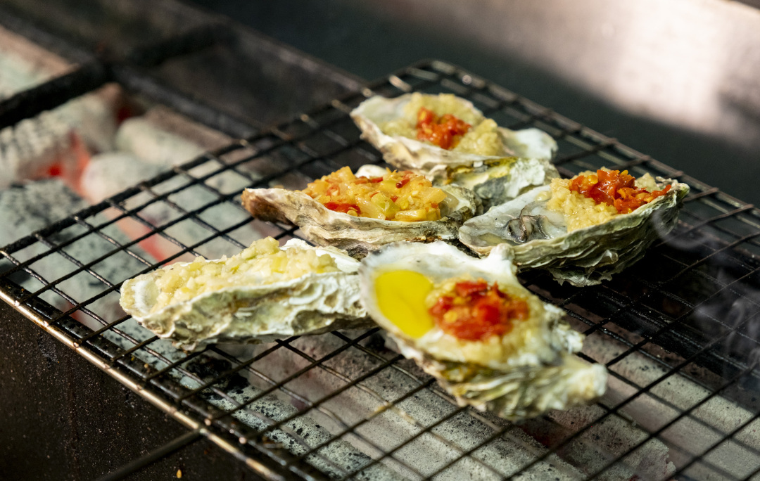 烤生蚝则有纯粹清烧的吃法,即是开好、处理干净以后放在炉上面烧烤,熟了吃时蘸芥末酱油,或者加蒜蓉酱烤制,还有一些加芝士、加鸡蛋的特色烤法。但最重要的前提,便是生蚝要足够新鲜,开渔期到来,为生猛的烧烤提供了最具优势的条件。