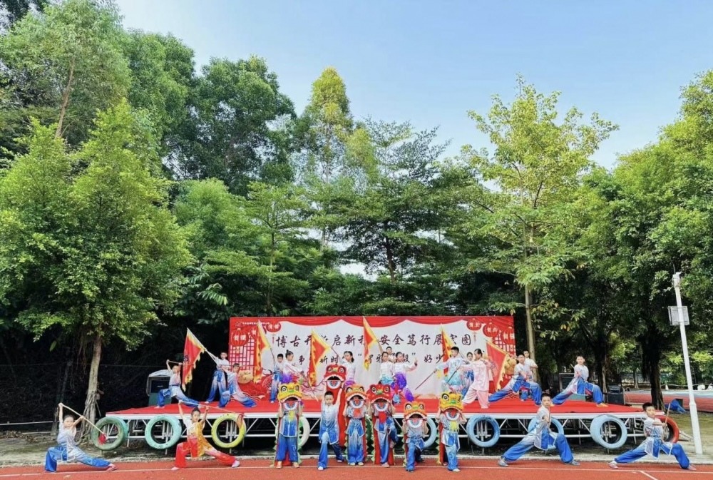 威武生猛的醒狮在校门口迎接全体师生的到来。学生返校一切正常,学校行政、值日老师、安保人员及家长义工在现场协助指挥交通。升旗礼上,南华小学以“传承奥运精神 砥砺强国之志”为主题,学校武术队和舞蹈队分别带来武术串烧和舞蹈表演,全校学生以传递奥运火炬的形式践行奥运精神。