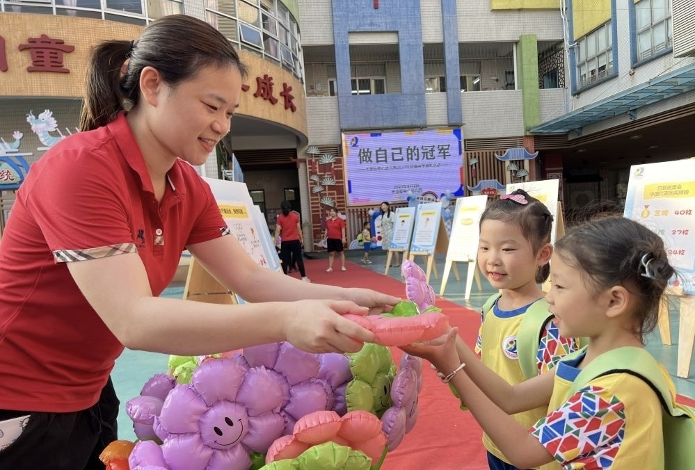 幼儿园内,奥运会主题创设的环境充满了朝气和活力。老师们给孩子们送上太阳花气球,迎接他们回园,寓意着孩子的未来如太阳花一样灿烂。在签到区上,孩子们在趣味跳高游戏中迎接新学期、新挑战。