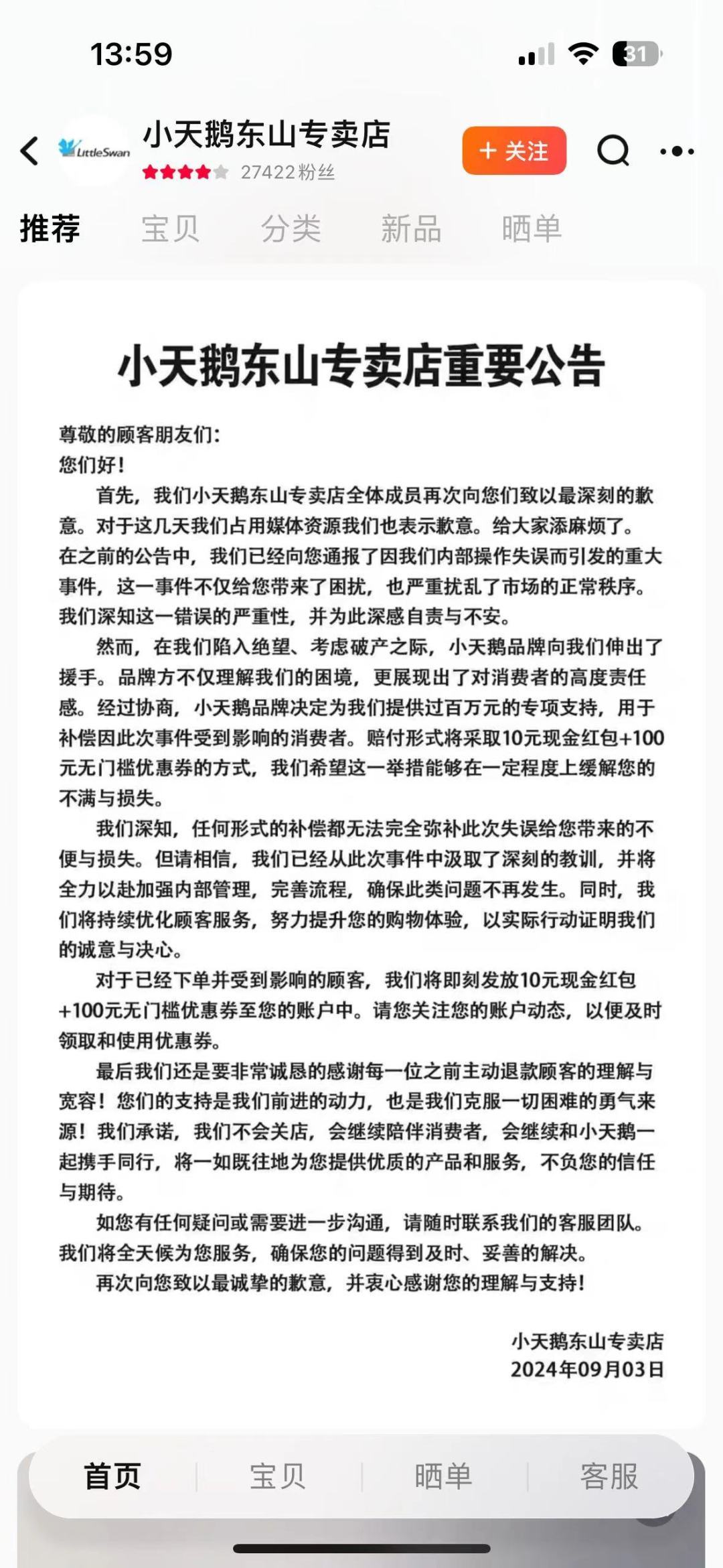 昨日,该事件也登上多个平台的热搜榜,引发社会关注。今日,该网店再度发公告称,在自己陷入绝望、考虑破产之际,小天鹅品牌伸出了援手。“品牌方不仅理解我们的困境,更展现出了对消费者的高度责任感。”据该公告称,经过协商,小天鹅品牌为该门店提供过百万元的专项支持,用于补偿因此次事件受到影响的消费者。赔付形式将采取10元现金红包+100元无门槛优惠券的方式。此外,该网店承诺不会闭店。