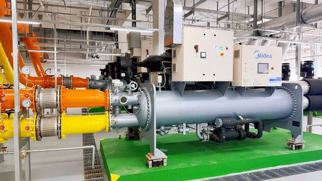 随后,通过分析各负荷段的时间占比,美的进行整体方案的设计选型。项目最终主机部分采用“两大一小”的选型配置,由2台700RT的变频直驱离心机组和1台350RT的变频直驱离心机组组成,覆盖不同负荷段制冷需求:2台700RT主要负责在夏季长时间、大体量的冷气需求;350RT则用于满足过渡季节(春、秋或冬季温热时)的低负荷运行。