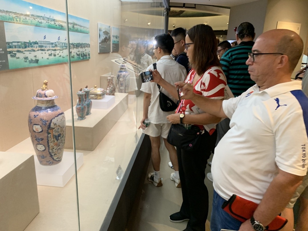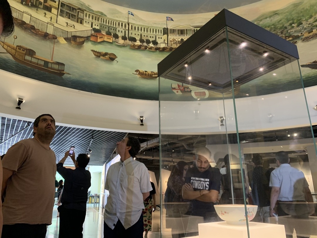 更让中外记者啧啧称奇的是各式各样的馆藏文物。十三行博物馆馆藏文物超过5000件,包括了广州彩瓷、通草画、广绣、象牙器、外销扇、五常家具及银器、珐琅器、玻璃画、水彩画、油画、漆器等文物,涵盖了清代广州的主要外销工艺品,展现了广州人民的勤劳、智慧及才华。