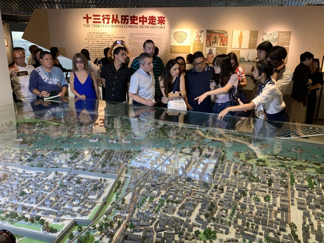 在博物馆,中外记者就被丰富的文献史料、文物所吸引,大家一边聆听解说,一边拿着相机、手机拍照,十三行当年的盛景,让记者们发出声声赞叹。在一幅十三行的沙盘地图上,记者们一边比划着地图上的模型建筑,一边将当时十三行和现在的广州街景做比较。