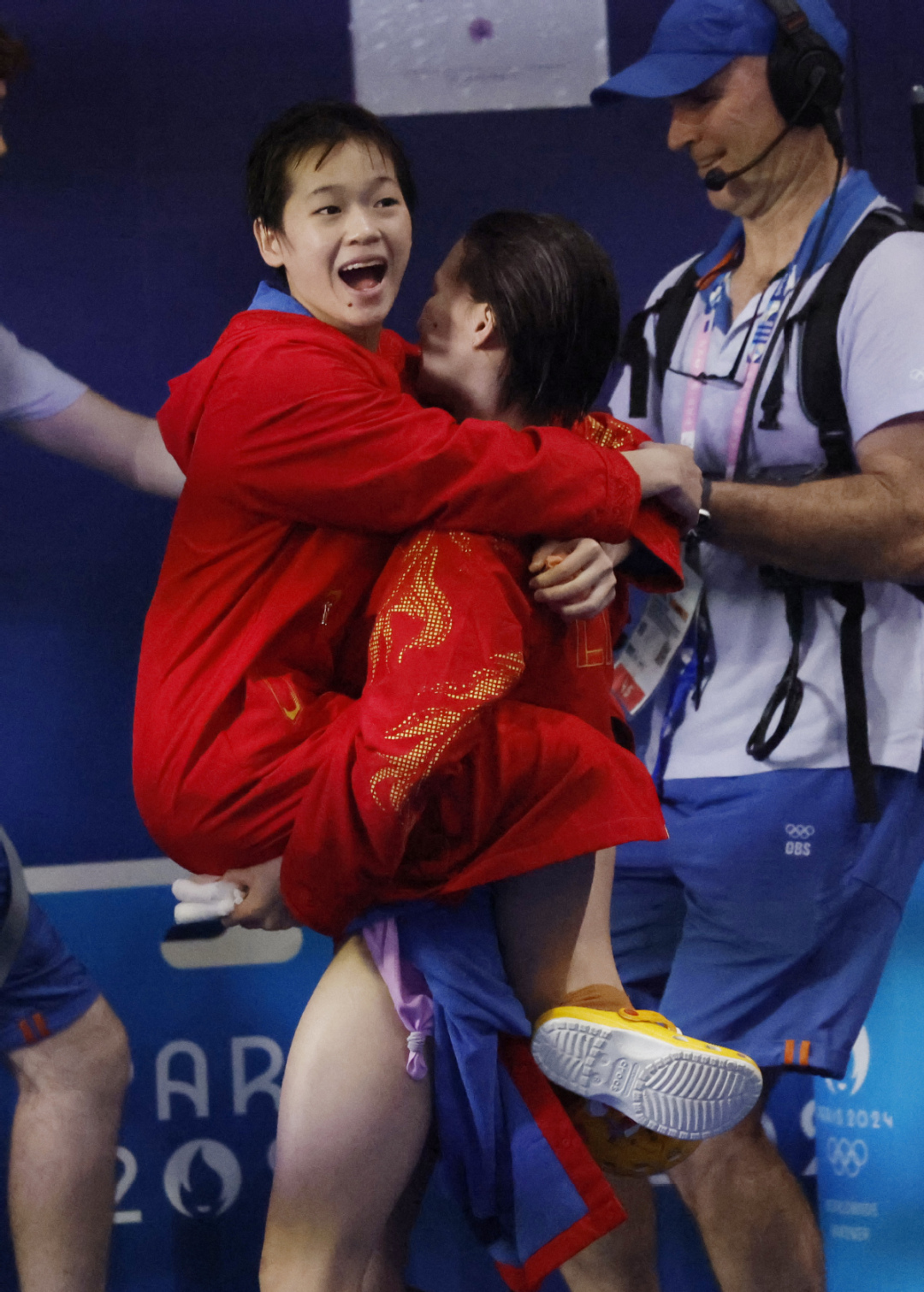 Chinese divers Quan Hongchan (left) and Chen Yuxi celebrate after winning the women's synchronized 10m platform diving gold medal at the Paris Olympics on July 31.[Photo/Xinhua]