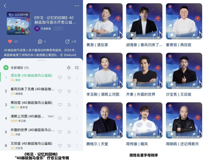 近日,腾讯音乐娱乐集团旗下平台QQ音乐、酷狗音乐、酷我音乐及全民K歌,携手9名“爱心传播官”黄渤、胡海泉、姜育恒、李玉刚、齐秦、沙宝亮、腾格尔、周传雄、周晓鸥,共同推出国内首张“40赫兹伽马音乐”疗愈公益专辑——《听见•记忆的回响》,用音乐与科技的融合,关爱阿尔茨海默病人群。