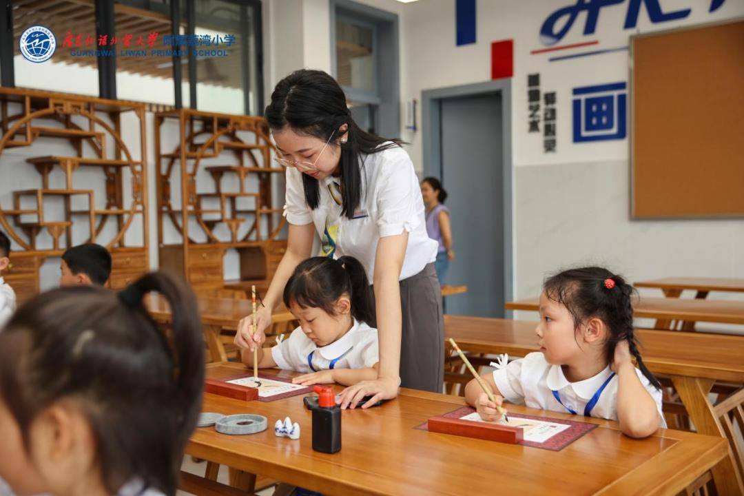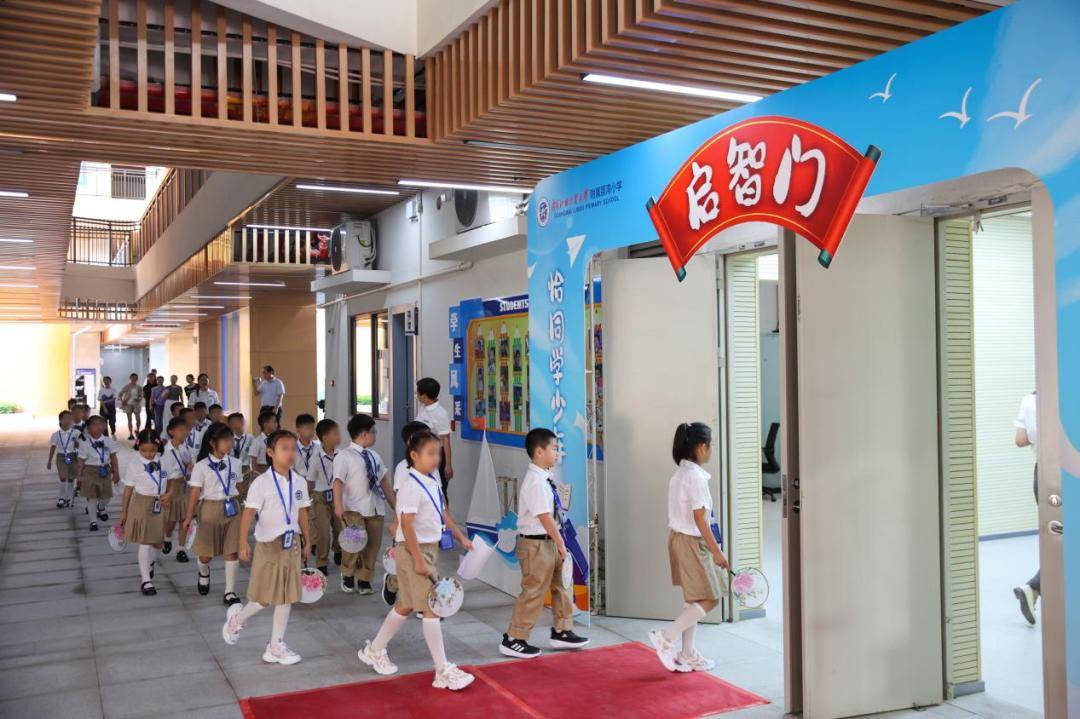 9月2日,正式启用的广外荔湾小学举行了开学仪式。为欢迎新学校的第一批入学学生,学校精心准备了一系列活动。步入校门,敲响“明志鼓”,第一批小学生在老师带领下穿过“启智门”——寓意开启孩子们的“人生智慧”之门,迎接新的人生篇章。