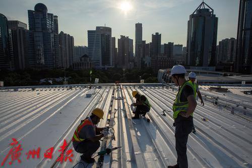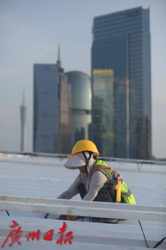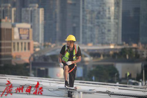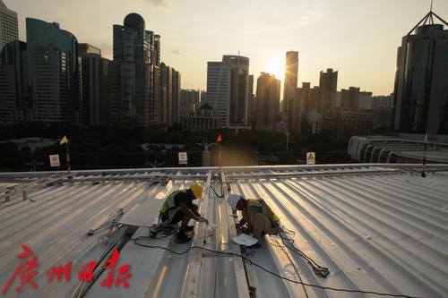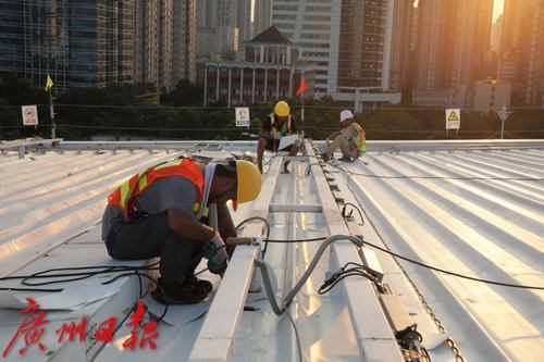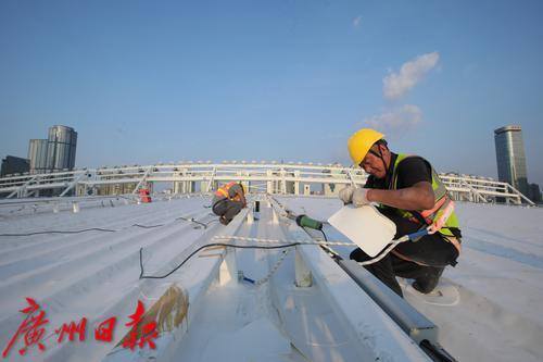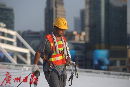 9月3日上午10时14分,广州市气象台发布高温橙色预警信号,预计未来两天广州市越秀区、天河区最高气温将接近37°C。当天下午5时许,虽然阳光有所减弱,但晒在皮肤上依然觉得疼痛。记者来到天河体育中心体育场,工人正在进行西面屋顶遮阳天棚的防水施工。