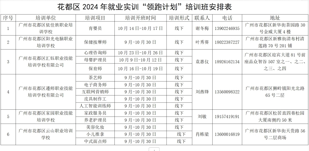 9月4日,记者从花都区人力资源和社会保障局获悉,广州市花都区2024年就业实训“领跑计划”培训班(免费),即日起开始报名。