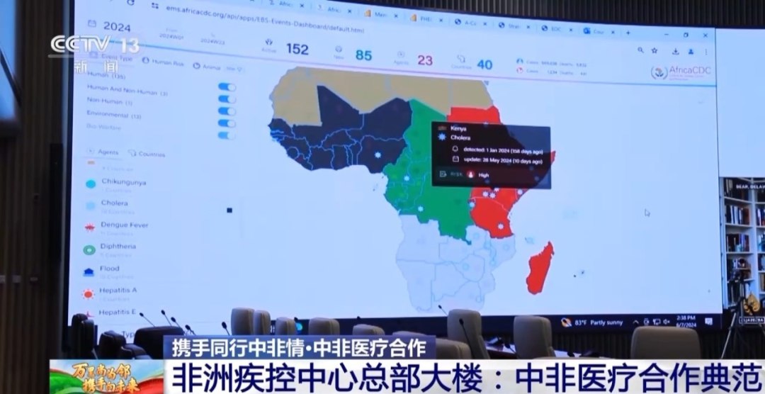 在位于非洲疾控中心八层的应急指挥大厅里,巨大的显示屏显示着新型冠状病毒、猴痘、埃博拉、登革热等传染病数据,配套设置有数据采集系统,可以让疾病数据第一时间上传到应急指挥大厅,确保数据实时更新,为疾控决策提供依据。