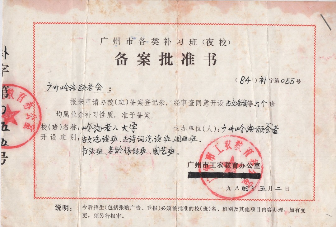 1984年,岭海老人大学被批准开设古文选读、国画、书法等6个班。(广州市岭海老人大学供图)