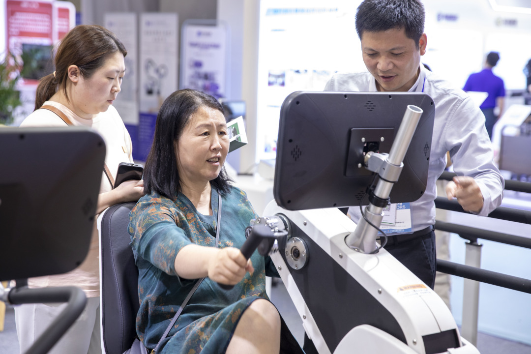 2024年8月,第八届广州老博会现场,观众体验智能化理疗设备。