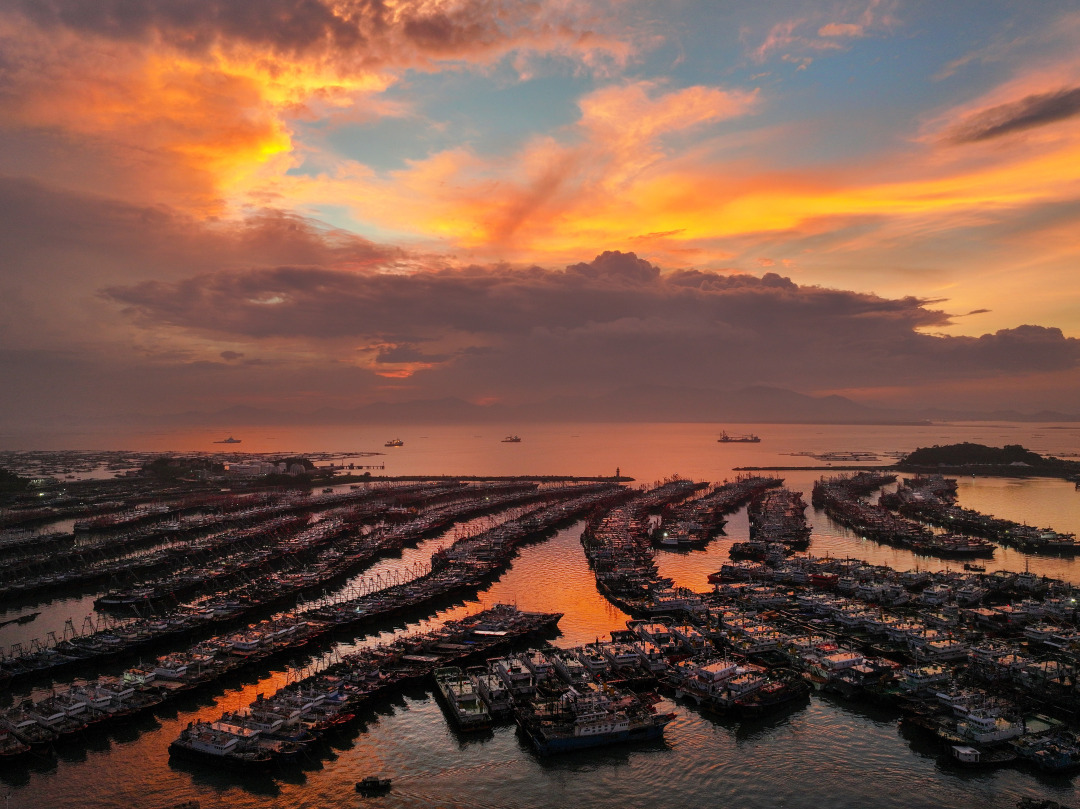 9月5日傍晚,超强台风“摩羯”逼近,在变幻莫测的晚霞映射下,广东省阳江市闸坡国家级中心渔港里,回港避风渔船有序排列,严阵以待抵御台风。各部门也严格按照“六个百分百”要求,扎实做好台风防御工作,全力保障人民群众生命财产安全。