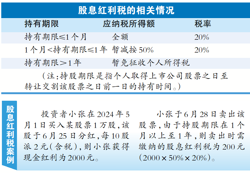 需要注意的是,个人持有上市公司的分红,会征收股息红利税。简单来说,持股时间越长,需缴纳的股息红利税越低。其中,持股在1个月以内,需缴纳20%;持股在1个月至1年,需缴纳10%(应纳税所得额暂减按50%,税率为20%);持股1年以上暂免。缴税时间方面,股息红利税的缴纳时间并不是在拿到分红当天,而是在卖出该股票后再缴纳。