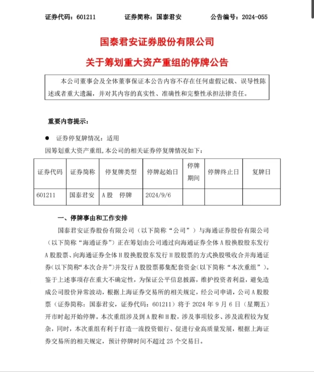 鉴于上述事项存在重大不确定性,为保证公平信息披露,维护投资者利益,避免造成股价异常波动,根据上海证券交易所的相关规定,经申请,国泰君安、海通证券A股股票将于2024年9月6日(星期五)开市时起开始停牌。公告称,本次重组涉及A股和H股,涉及事项较多、涉及流程较为复杂,同时,本次重组有利于打造一流投资银行、促进行业高质量发展,根据上海证券交易所的相关规定,预计停牌时间不超过25个交易日。