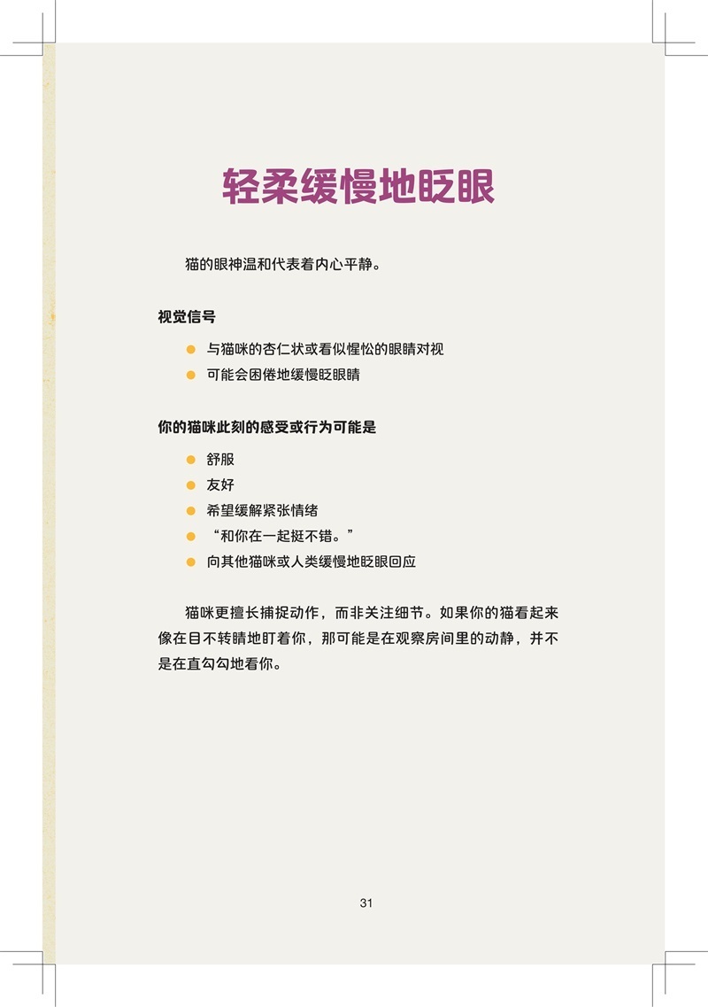 这本有趣而精练的读物以活泼俏皮且信息丰富的插图为特色,主要关注猫咪的肢体语言,通过生动的图画和文字,带读者学会识别猫咪的叫声、动作以及表情等背后的含义,指导猫咪主人进行让猫咪感到快乐和安全的互动,帮助人们了解猫咪并与其建立良好关系。
