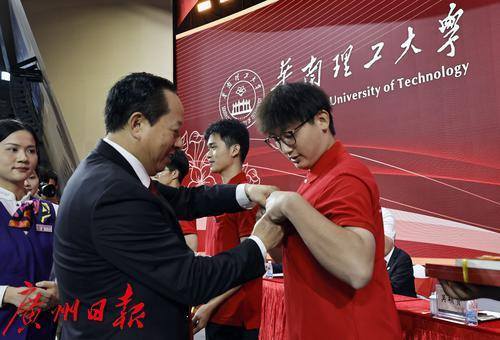 开学典礼现场举行了校徽佩戴仪式。华南理工大学党委书记章熙春为新生代表佩戴校徽,并赠送入学礼,教育全体新生要将“赓续甲工精神,肩负时代使命”的承诺与担当铭记于心。 唐洪武校长致辞 中国工程院院士、华南理工大学校长唐洪武作题为《激扬青春理想 自信平视世界》的致辞。