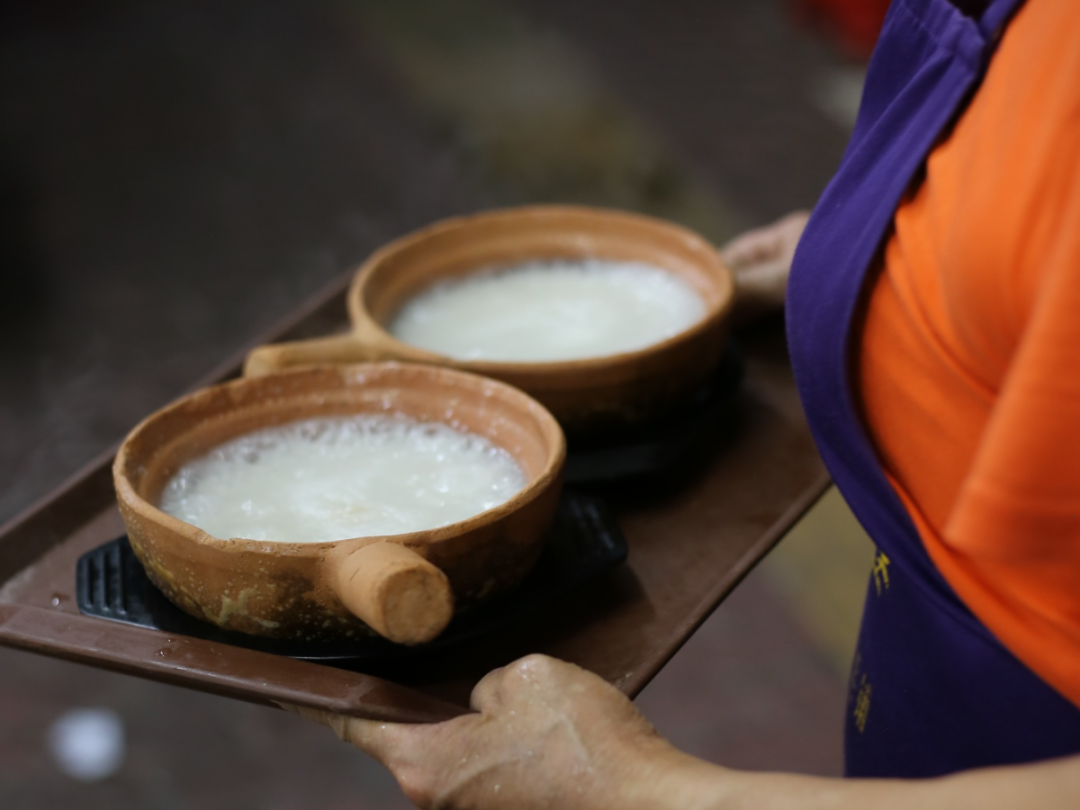 此时,两锅仍在沸腾的砂锅白粥刚好被端上来,这正是下鱼片的最佳时机。将鱼片和芫荽生菜丝一同入粥,用勺子略拌几下,鱼片已经熟了。“先吃鱼肉试试。”赶紧试吃一口,鱼肉果然又嫩又鲜甜。吃罢鱼片再喝粥,淡淡鲜甜萦绕舌尖。
