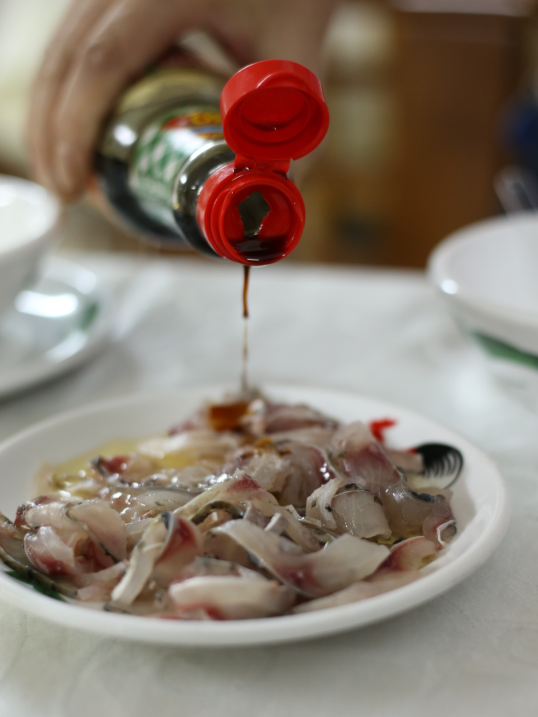 一条1.3斤重的鲫鱼,正适合“二人食”:鱼肉起片滚粥,一人一煲;鱼骨清蒸,鲜味共尝。由于鲫鱼是客人即点即劏即起片,所以需耐心等候。最先上桌的是盐、花生油、生抽以及一小碟芫荽和生菜丝,这是何用?陈姨的弟弟陈先生表示,调味料是给食客自己捞鱼片用的。“有的客人不是很懂得怎么捞鱼片,不懂得怎么调味,味道就会没那么好。”原来,捞鱼片也有讲究。只见陈先生先撒一小撮盐,拌匀后淋上花生油,再添几滴豉油,将鱼片捞至顺滑,稍微有点起胶状。